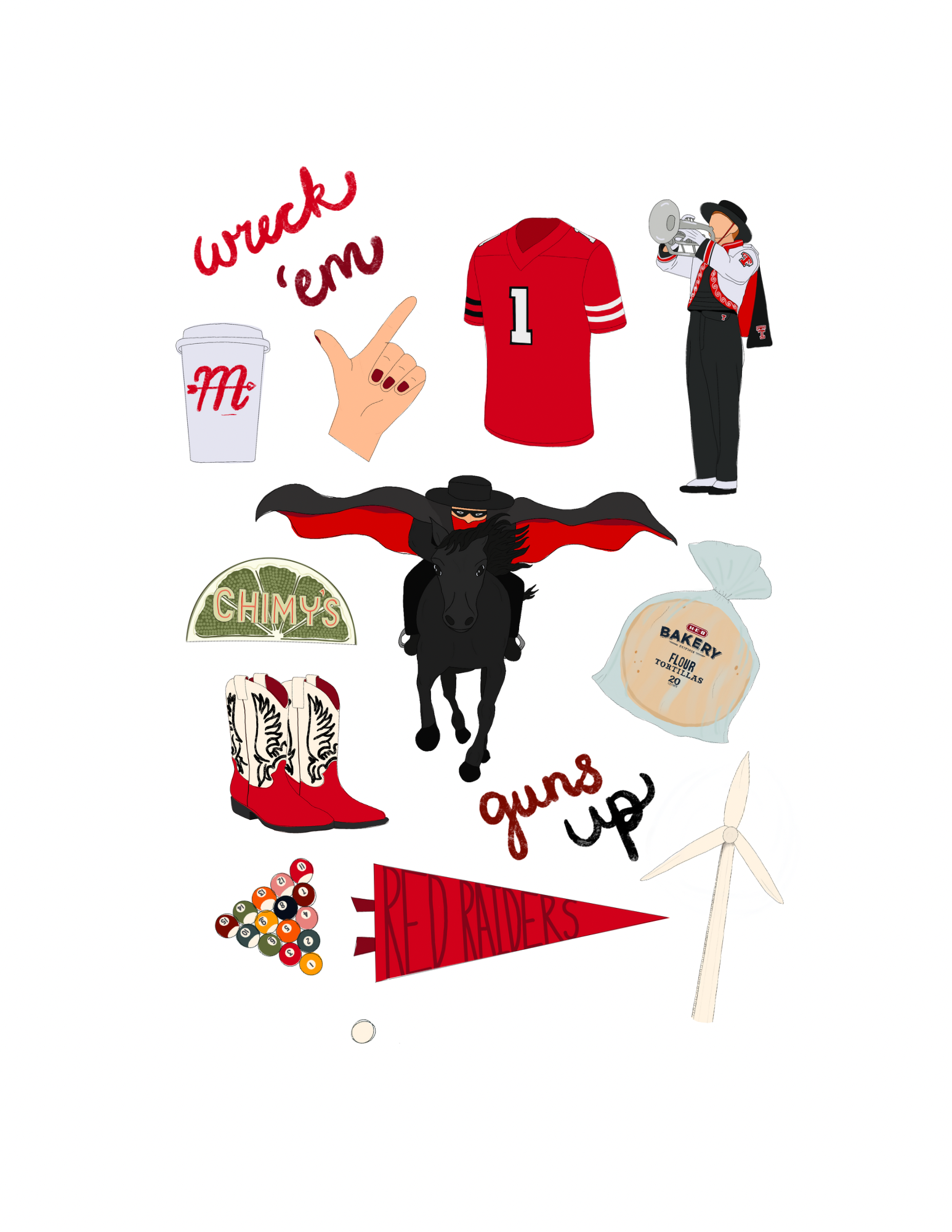 This artwork is an original creation and is not affiliated with or endorsed by Texas Tech University. All items are hand drawn on Procreate.